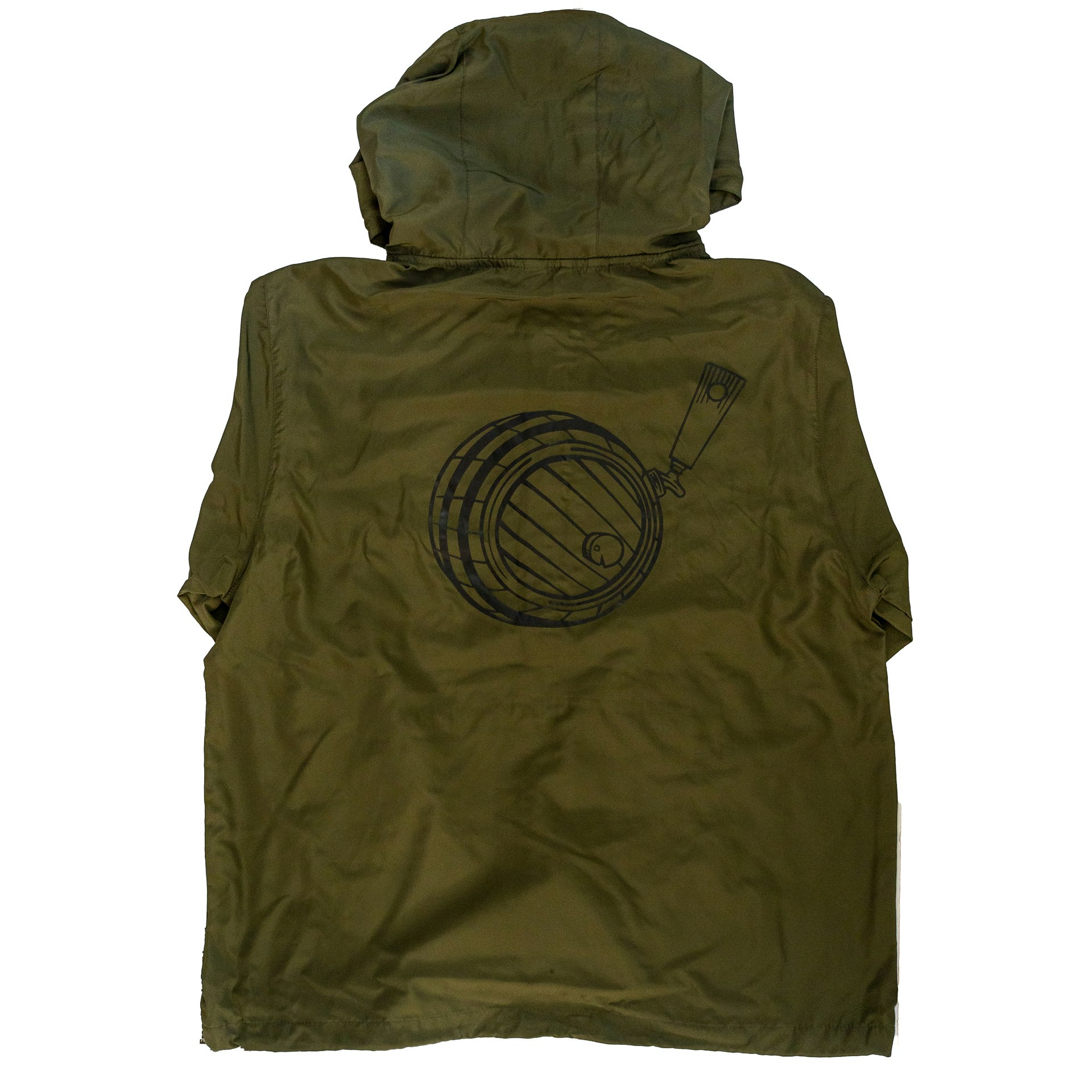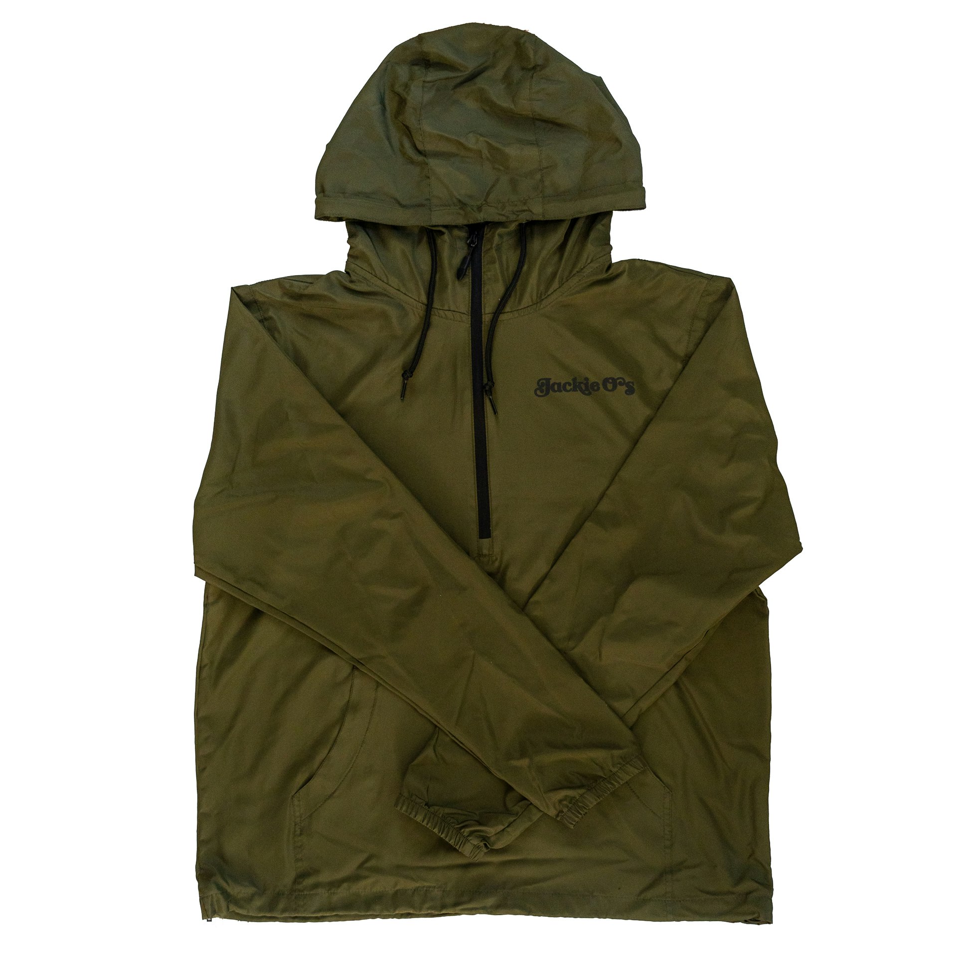 Independent Trading Co. army green 3/4 zip windbreaker with the Jackie O’s logo on the front and the barrel logo on the back in black.