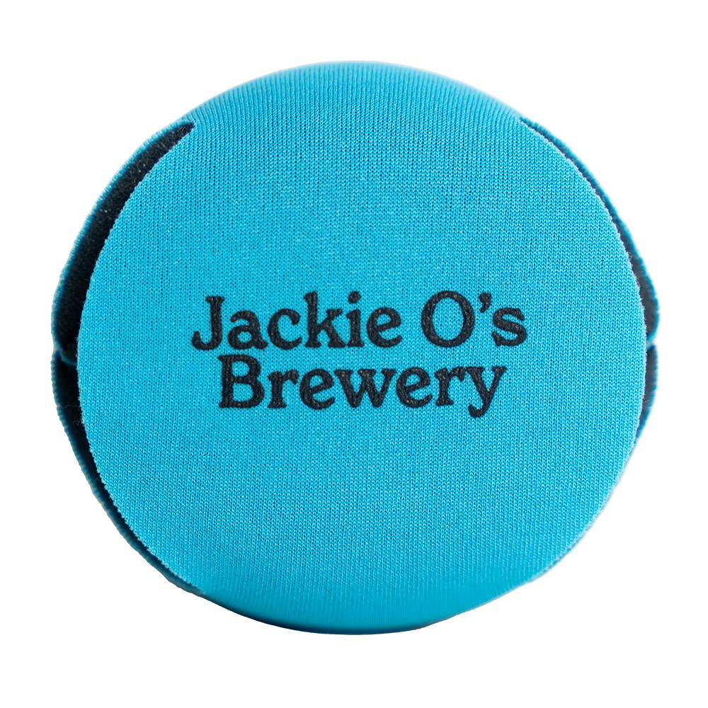 Keep your cans cold with a foam Barrel Character bright blue can koozie with black screen print on both sides and our Jackie O’s Brewery logo on the bottom.