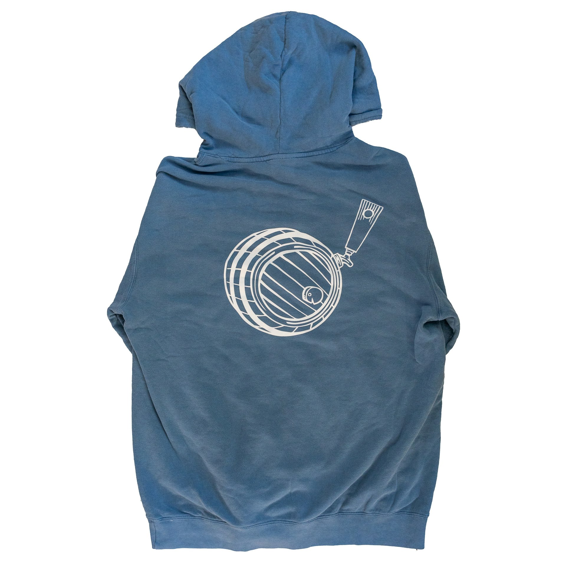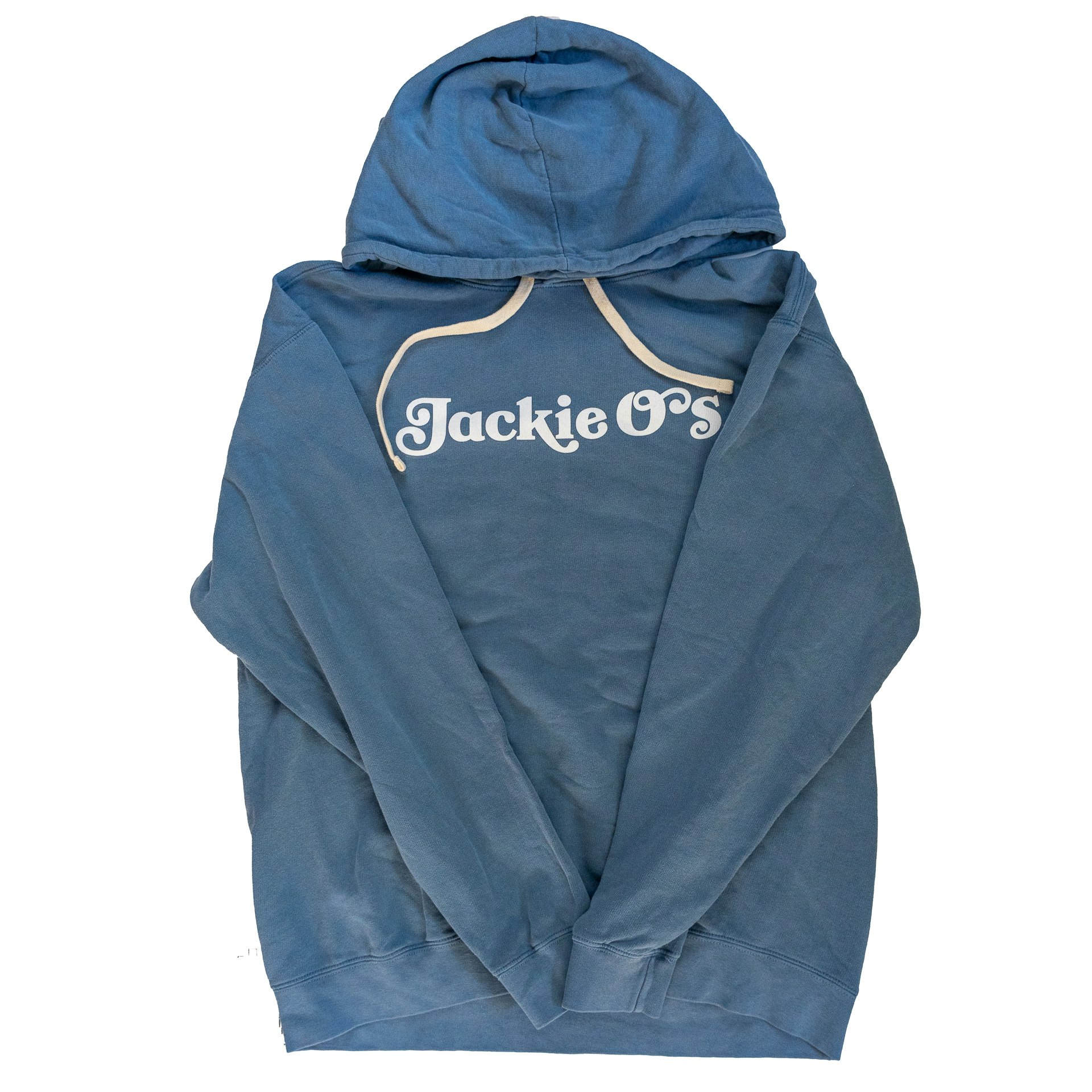 Comfort Colors blue hoodie with the Jackie O’s logo in white on the front and the barrel logo in white on the back.