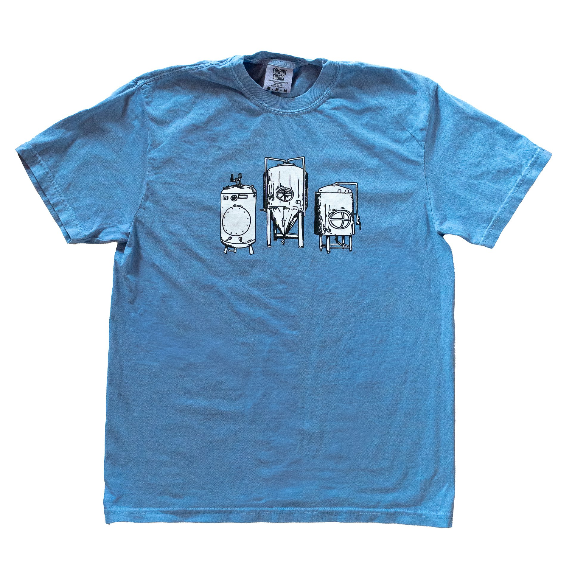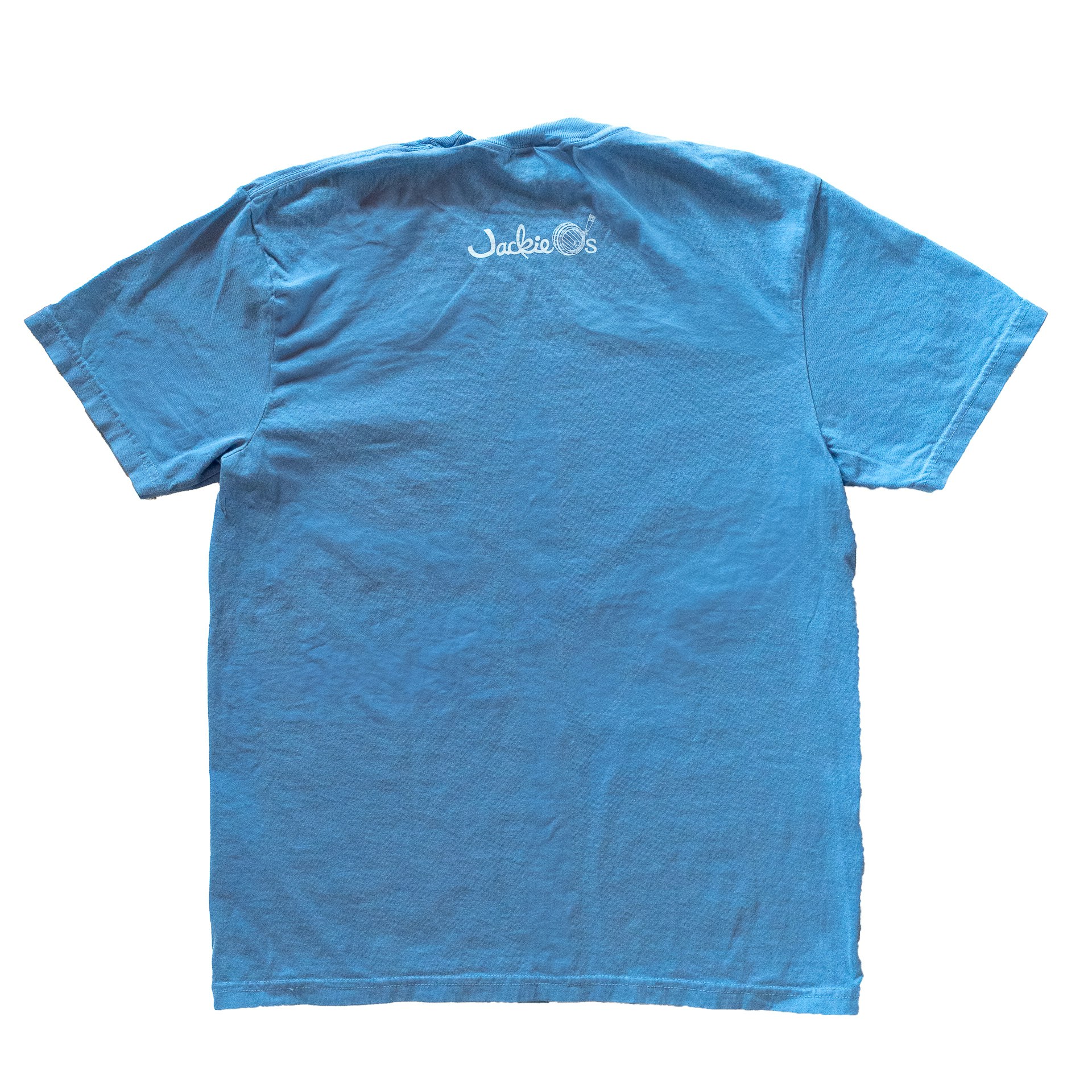 Comfort Colors garment-dyed heavyweight “washed denim” blue shirt with the Jackie O’s Three Tank logo screen printed in white and black on the front and “Jackie O’s” in white on the back.