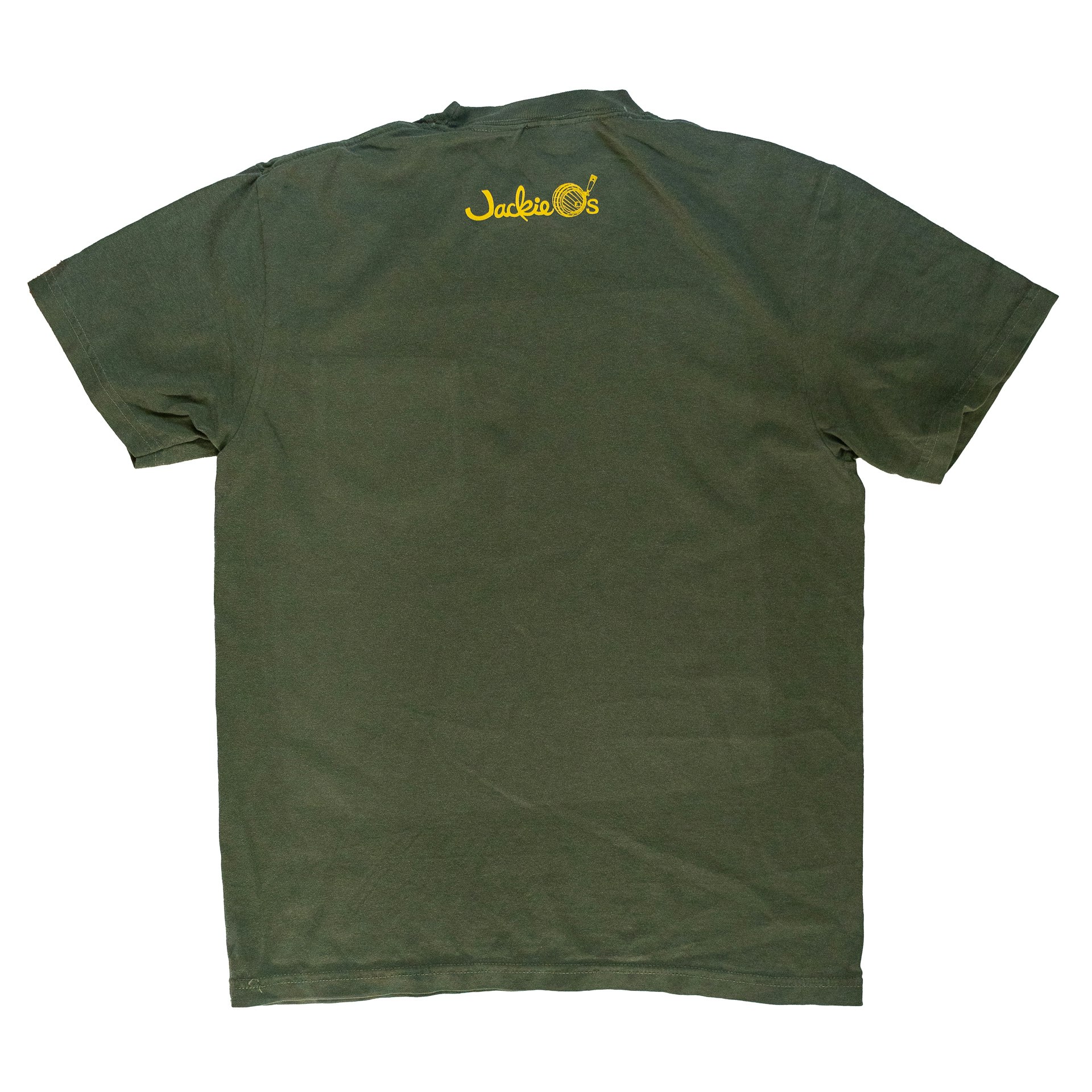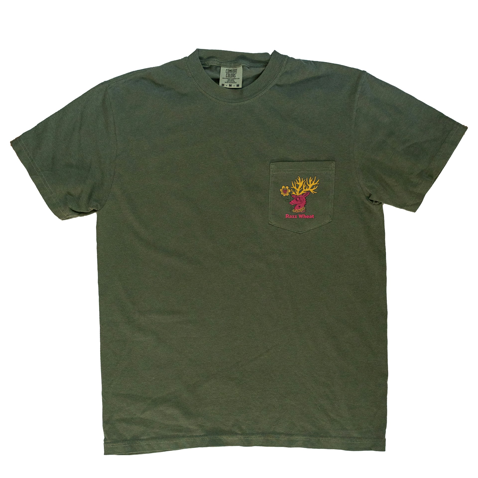 Comfort Colors moss green pocket tee with the classic Razz Wheat deer logo on the front pocket and the Jackie O’s logo in yellow on the back.