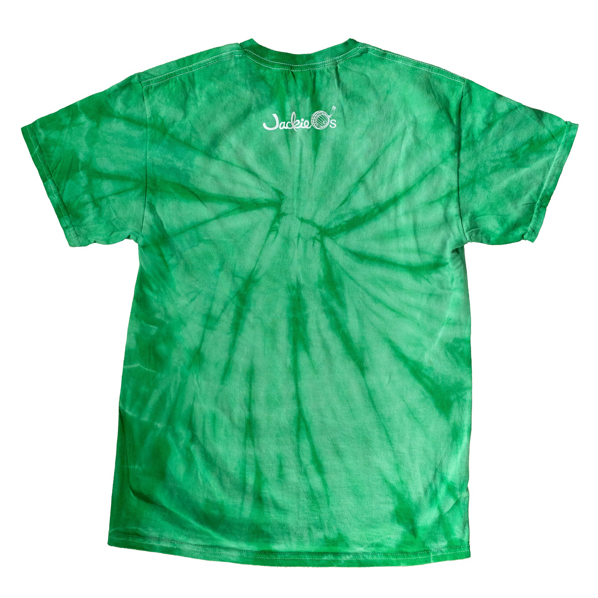 Colortone brand green tie dye short sleeve shirt with the Jackie O’s Grateful Barrel printed in white on the front and the Jackie O’s logo in white on the back.
