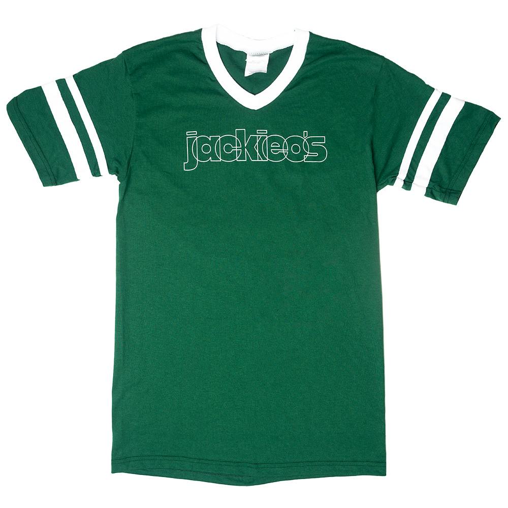 Jackie O’s logo screen printed in white on the front of a green V-neck jersey with white striped sleeves. Augusta Sportswear brand 50% Cotton & 50% polyester knit jersey.