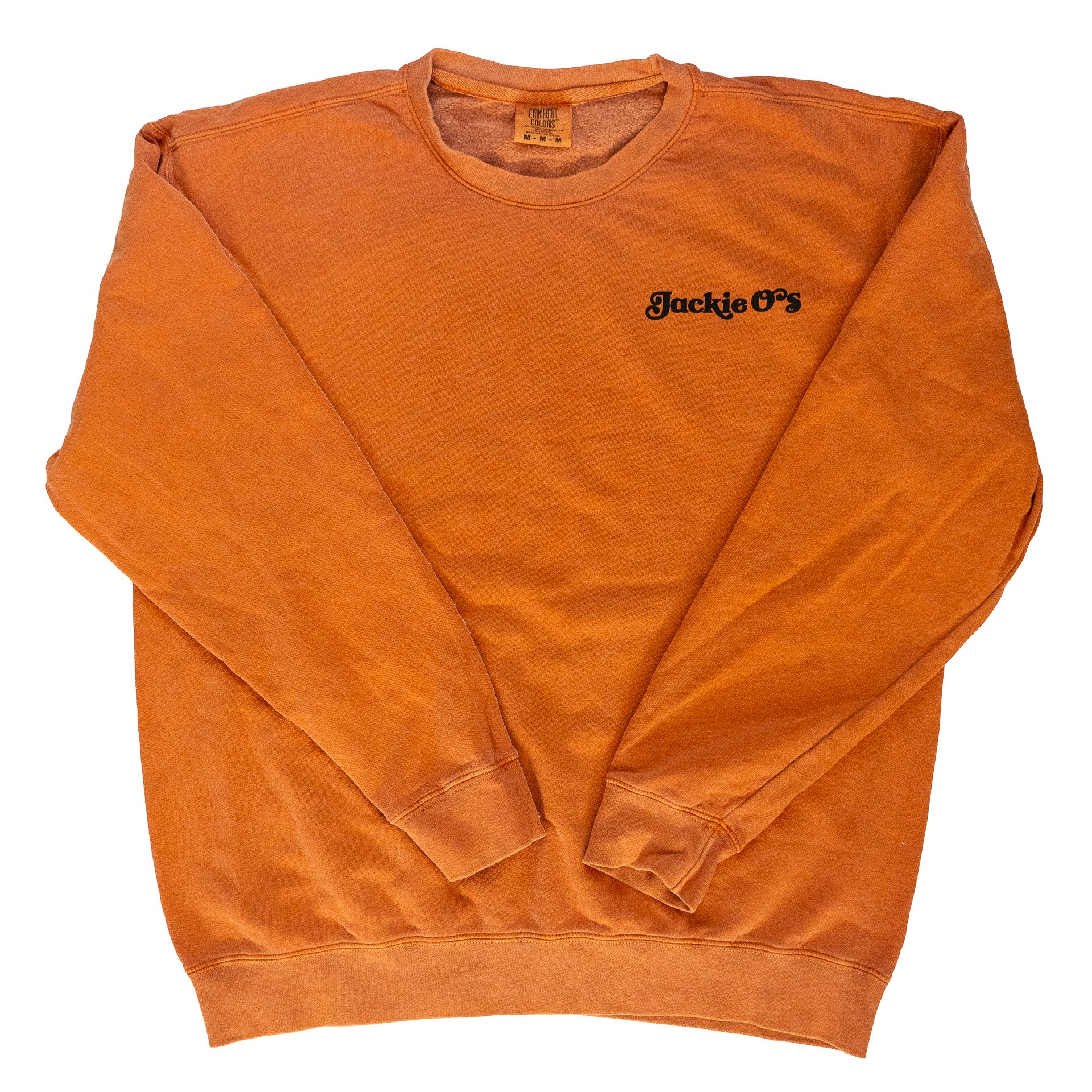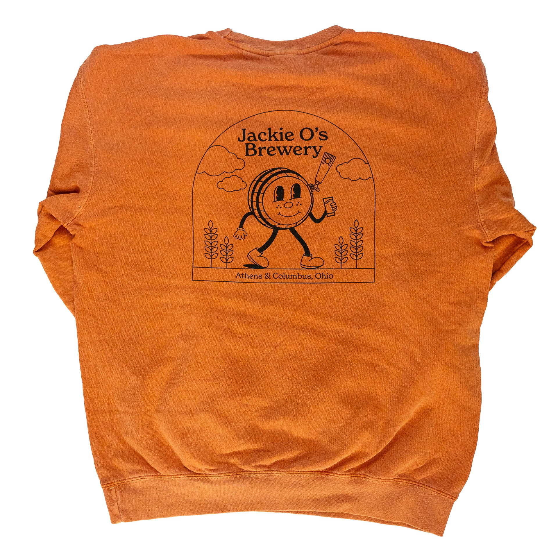 Comfort Colors yam orange crewneck with the Jackie O’s Brewery logo on the front and the barrel character on the back in black.