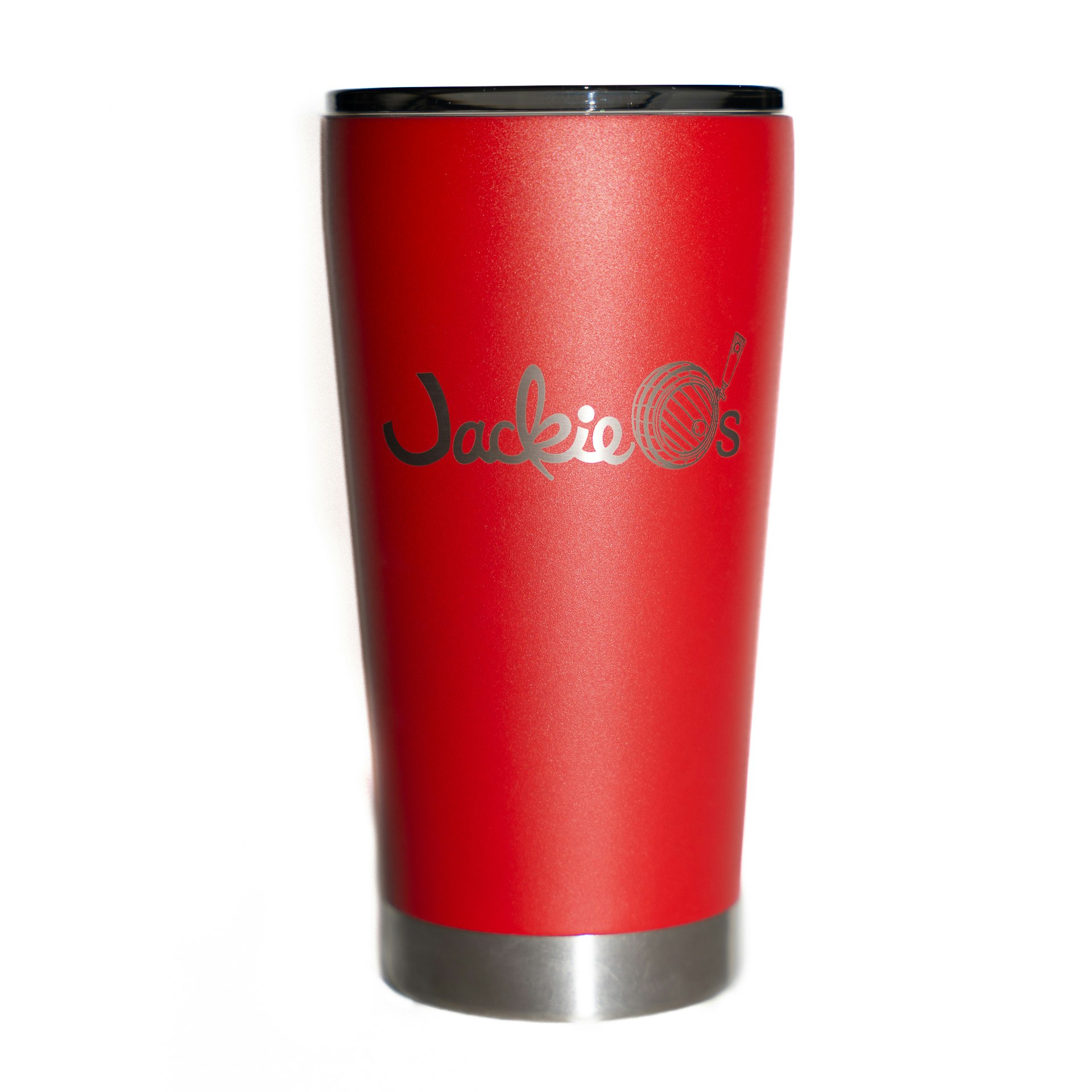 This red 16oz insulated tumbler has the Jackie O’s logo lazer engraved on one side! Ideal to use as your everyday coffee cup or enjoy a cold one on a hot summer day. The 16oz tumbler is designed to fit comfortably in your hand and most car cup holders. HAND WASH ONLY.