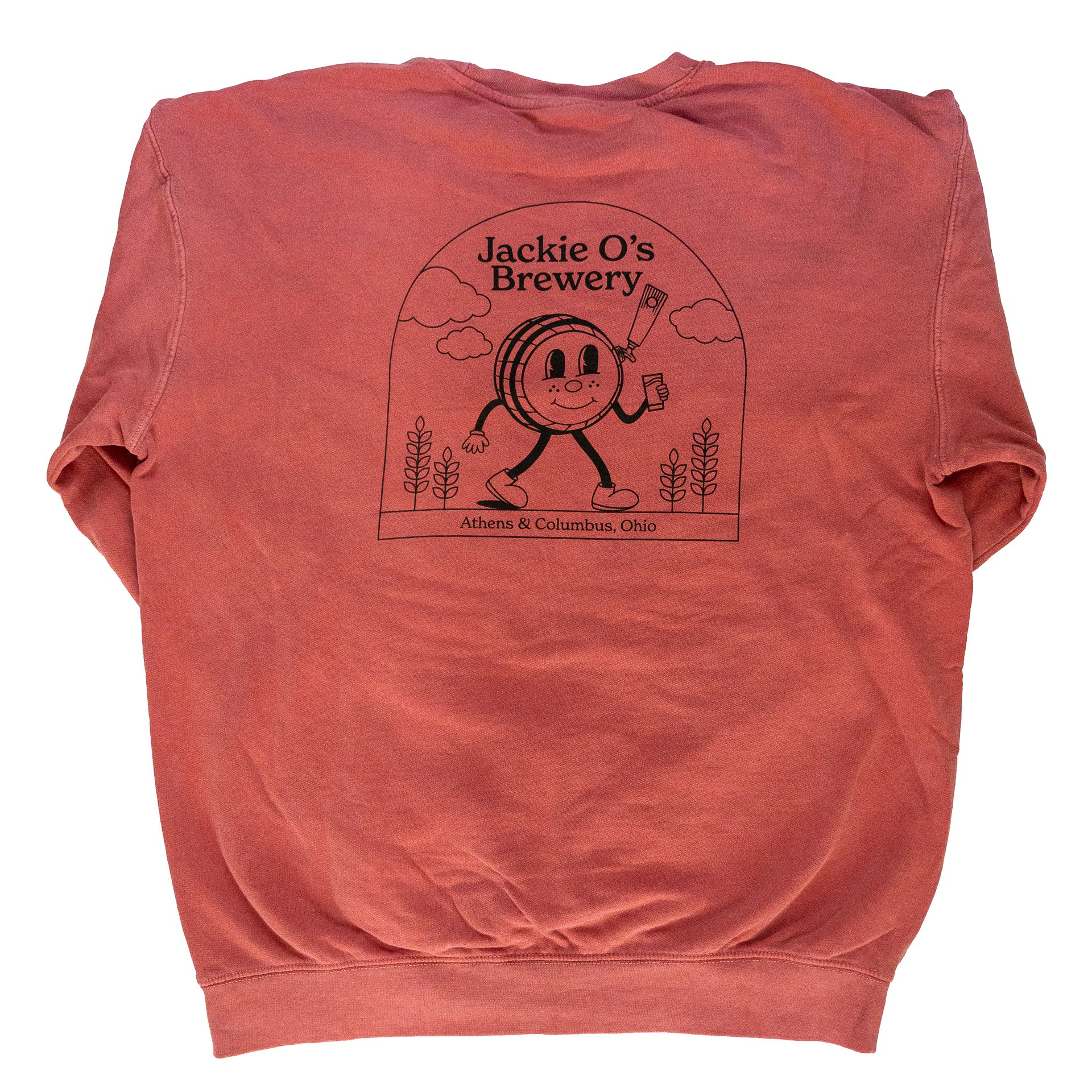 Comfort Colors crimson red crewneck with the Jackie O’s Brewery logo on the front and the barrel character on the back in black.