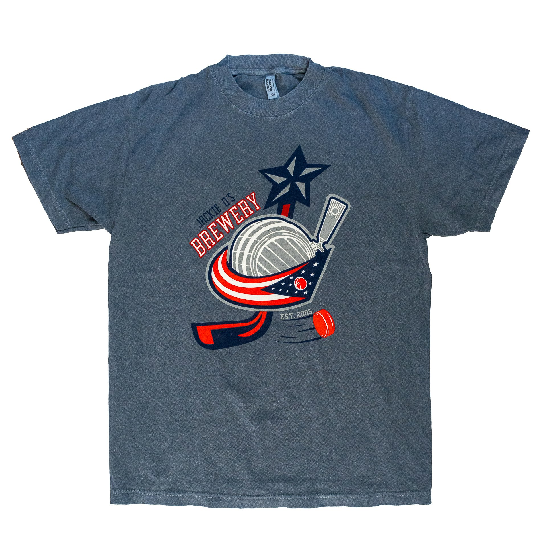 Let’s “Celly”! Faded navy American Apparel shirt with a special sports related Jackie O’s Brewery design on the front.