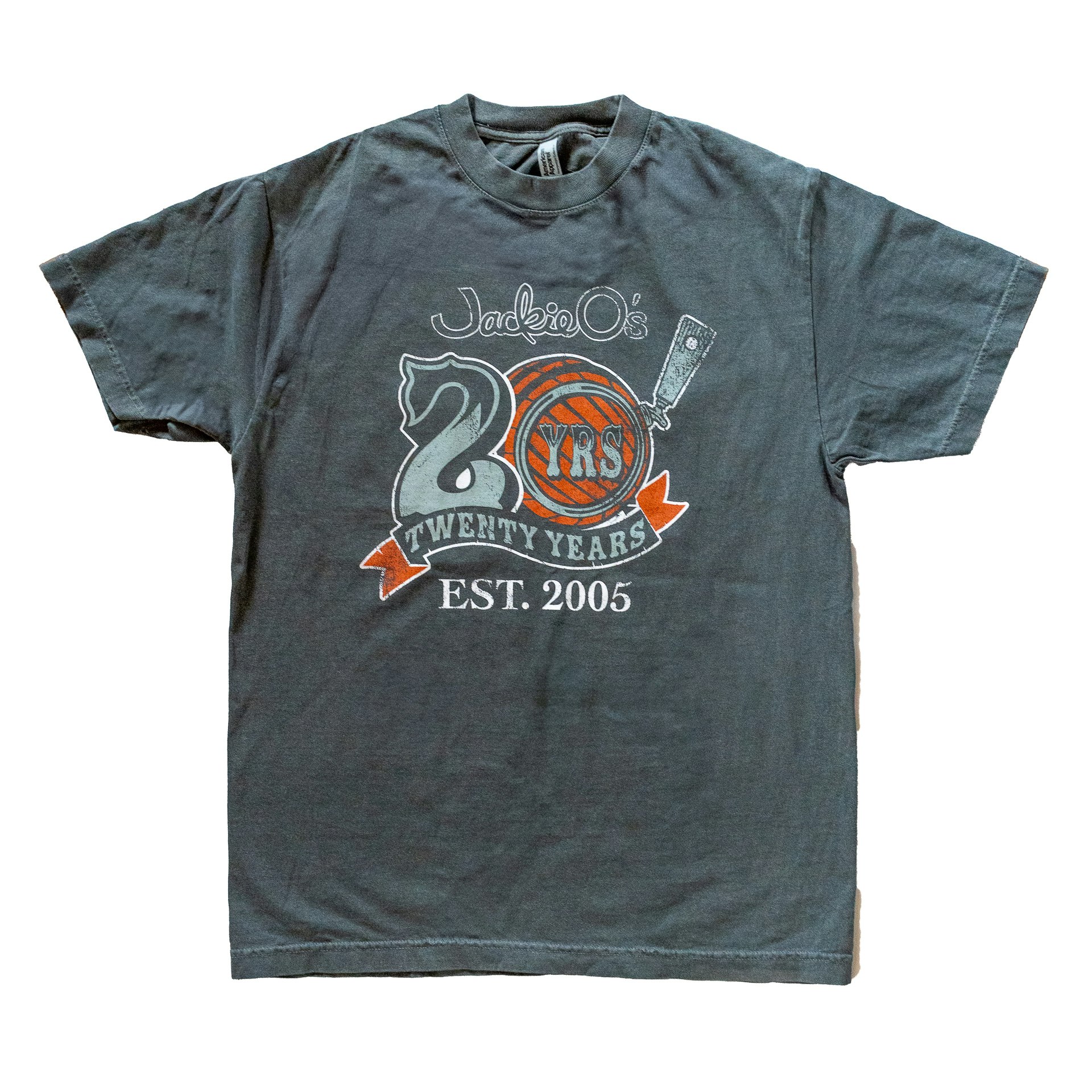 This American Apparel 100% heavyweight cotton unisex vintage wash black shirt features a distressed Jackie O’s 20th Anniversary design . Celebrate 20 years with us!